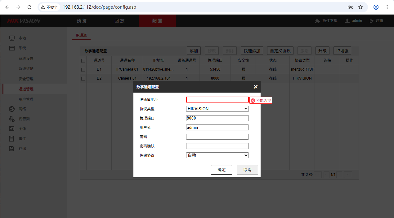 这里以海康录像机为例,在配置栏目里选择【通道管理】,点击页面上的【自定义添加】按钮,如下图所示: