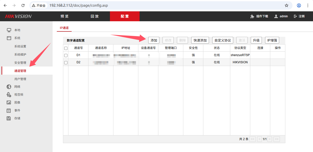 输入录像机的用户名和密码登录进入控制台,登录成功后选择【配置】栏目下的【通道管理】页面,找到通道管理页面上的【添加】按钮,如下图所示: