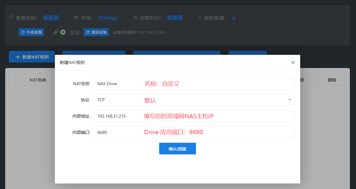 3. 编辑规则:在神卓N600管理面板(电脑登录),添加群晖NAS:主机IP地址、添加 Drive 端口:6690
